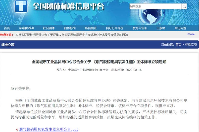 全國城市工業(yè)品貿(mào)易中心聯(lián)合會關(guān)于《煙氣脫硝用臭氧發(fā)生器》團(tuán)體標(biāo)準(zhǔn)立項(xiàng)通知